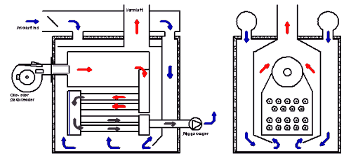 From the convection pipes the exhaust is lead to the exhaust heat exchanger, where the rest of the heat from the combustion and the exhaust are lead through the exhaust ventilator to the chimney. Process air is supplied to the heat exchanger by the exchangers insulated cover. At first it is heated by the exhaust heat exchanger and then lead through the maze of convection pipes, over the combustion chamber and through to the exhaust outlet.